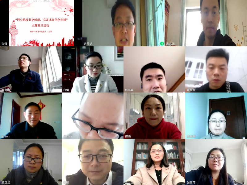 活动当天,教工一支部书记段志贵、教工二支部书记孙映成、员工一支部临时负责人卞玉洁及员工二支部书记崔冶敏分别带领各支部党员共同学习了《中共教育部党组关于教育系统学习贯彻习近平总书记在“不忘初心、牢记使命”主题教育总结大会上的重要讲话的通知》精神,以及《关于贯彻落实<2019-2023年全国党员教育培训工作规划>实施细则》《党委(党组)全面从严治党主体责任规定》的相关内容。各党支部书记公开近期党务工作,特别对广大师生党员在居家抗疫期间,积极响应党中央对广大党员的号召,积极捐款真诚奉献爱心,用实际行动支持新冠肺炎疫情防控工作,并在完成教学、科研、管理、学习等任务的同时,坚持每天登陆学习强国平台进行自主学习,总支总体排名位列公司前列等,进行了充分肯定。师生党员在线上进行热烈交流,党员代表结合活动主题进行发言。教工二支部还为本月入党的顾正兰同志过了政治生日。