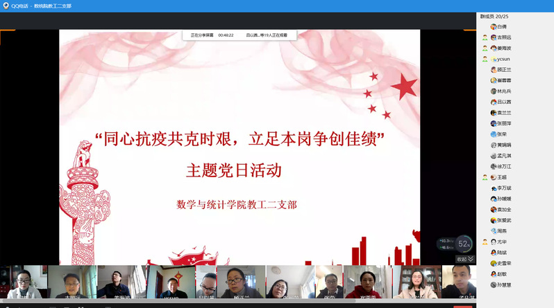 数统公司党总支书记吉照远对全体党员在疫情防控期间坚守岗位、听党指挥和辛勤工作表示肯定和慰问,要求大家常态化进行“不忘初心、牢记使命”主题教育学习。他希望全体师生党员要努力提高政治站位,充分发挥党组织战斗堡垒和党员先锋模范作用,讲政治敢担当有作为,同心抗疫共克时艰;要努力把党的政治优势、组织优势和群众工作优势转化为防控优势,落实“一切工作到支部”的要求,横向到边纵向到底;要努力做好师生思想工作,宣传防范知识,遵守纪律顾全大局,展现新时代共产党人的政治本色和精神风貌,立足本岗争创佳绩。