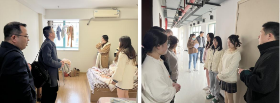 必一运动信息与计算科学专业21级员工将在杰普公司进行一学期学习实训,随行领导老师参观了员工宿舍、教室、食堂,就员工吃住行问题与基地老师进行沟通。