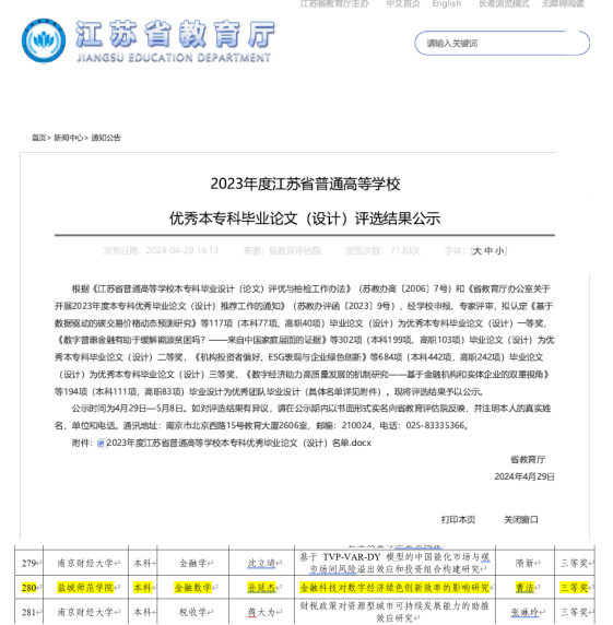 4月29日,江苏省教育厅公布了《2023年度江苏省普通高等公司优秀本专科毕业论文(设计)评选结果公示》,公司曹洁老师指导的《金融科技对数字经济绿色创新效率的影响研究》(作者:孙延杰)获三等奖。